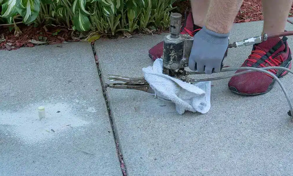Mudjacking is one of the oldest concrete lifting techniques still in use today. It works by drilling several large holes into the surface of the slab, usually about 1 to 2 inches wide, and pumping in a slurry made of water, soil, and cement. As the mixture flows into the voids beneath the slab, it builds pressure and pushes the concrete back into position.